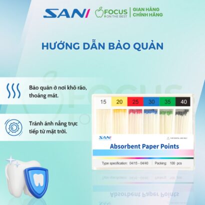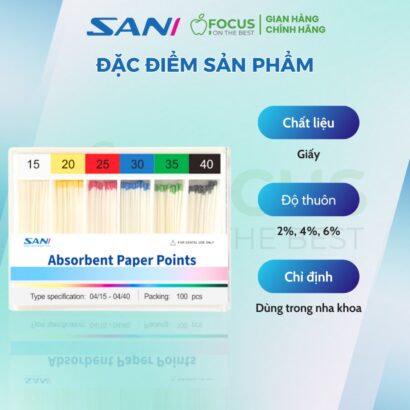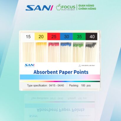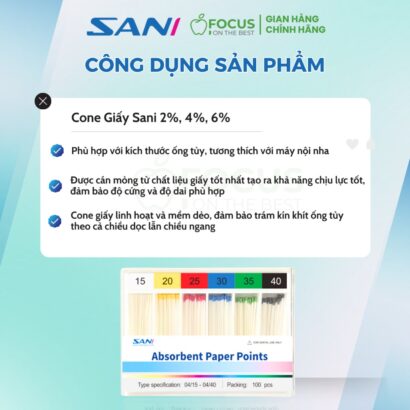 Cone Giấy Nha Khoa Sani là lựa chọn hoàn hảo cho quá trình trám bít ống t.ủy trong các thủ thuật nội nha. Được sản xuất từ chất liệu giấy cao cấp, sản phẩm đảm bảo sự linh hoạt, độ cứng và độ bền tối ưu, giúp nâng cao hiệu quả điều trị nha khoa.