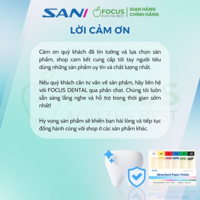 Lời cảm ơn: Chúng tôi xin chân thành cảm ơn quý khách đã tin tưởng và lựa chọn Cone Giấy Nha Khoa Sani. Shop cam kết cung cấp sản phẩm uy tín và chất lượng cao nhất. Nếu cần tư vấn thêm, hãy liên hệ với chúng tôi qua phần chat. Hy vọng sản phẩm sẽ mang lại sự hài lòng và quý khách sẽ tiếp tục đồng hành cùng chúng tôi trong các lần mua sắm sau! cam kết cung cấp sản phẩm uy tín và chất lượng cao nhất.