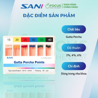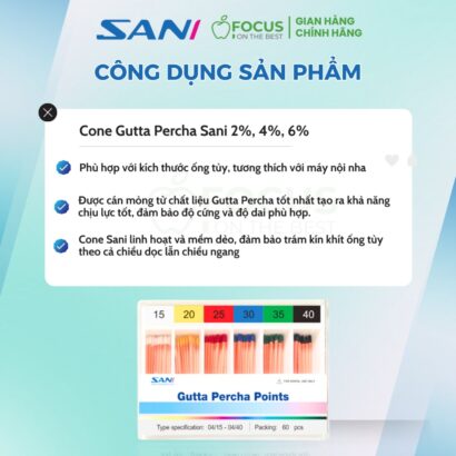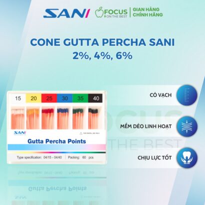 Cone Gutta Percha Sani là lựa chọn hàng đầu cho các chuyên gia nha khoa khi cần một sản phẩm trám kín ống tủy đáng tin cậy. Được chế tạo từ chất liệu Gutta Percha chất lượng cao với các độ thuôn 2%, 4%, và 6%, sản phẩm này tương thích hoàn hảo với kích thước ống tủy và trâm máy nội nha.