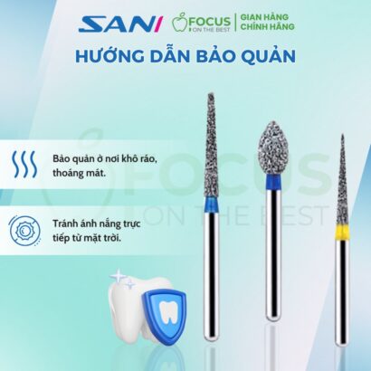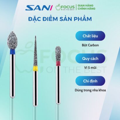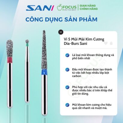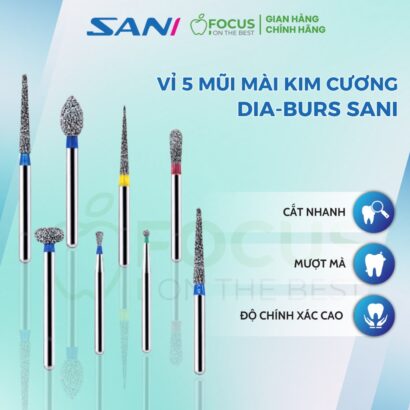 - Mũi khoan kim cương Dia-Burs Sani là sản phẩm đạt tiêu chuẩn ISO 806, với đầu mũi khoan được tạo thành từ nhiều lớp bột carbon kim cương thông qua kỹ thuật mạ kẽm tiên tiến.